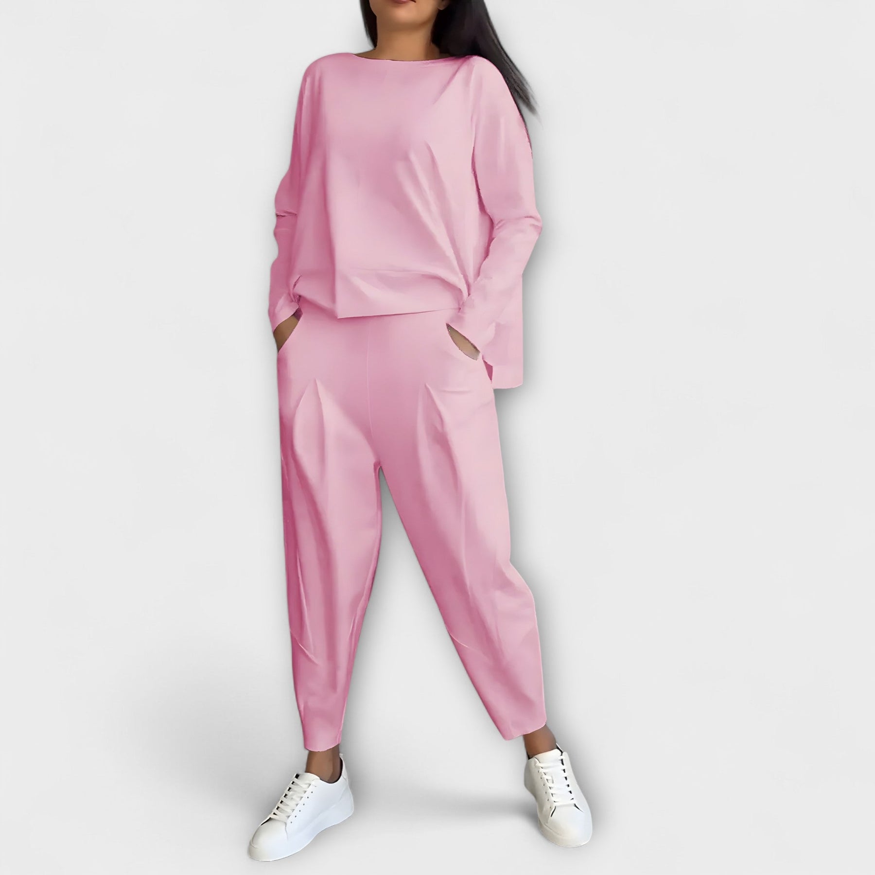 El conjunto de ocio Michela con mangas largas es la combinación perfecta de elegancia relajada y comodidad incomparables. Con cuello redondo y mangas largas, este conjunto es ideal para días cómodos en casa o excursiones relajadas. Ofrece la máxima libertad de movimiento y te mantiene a la vez estiloso.