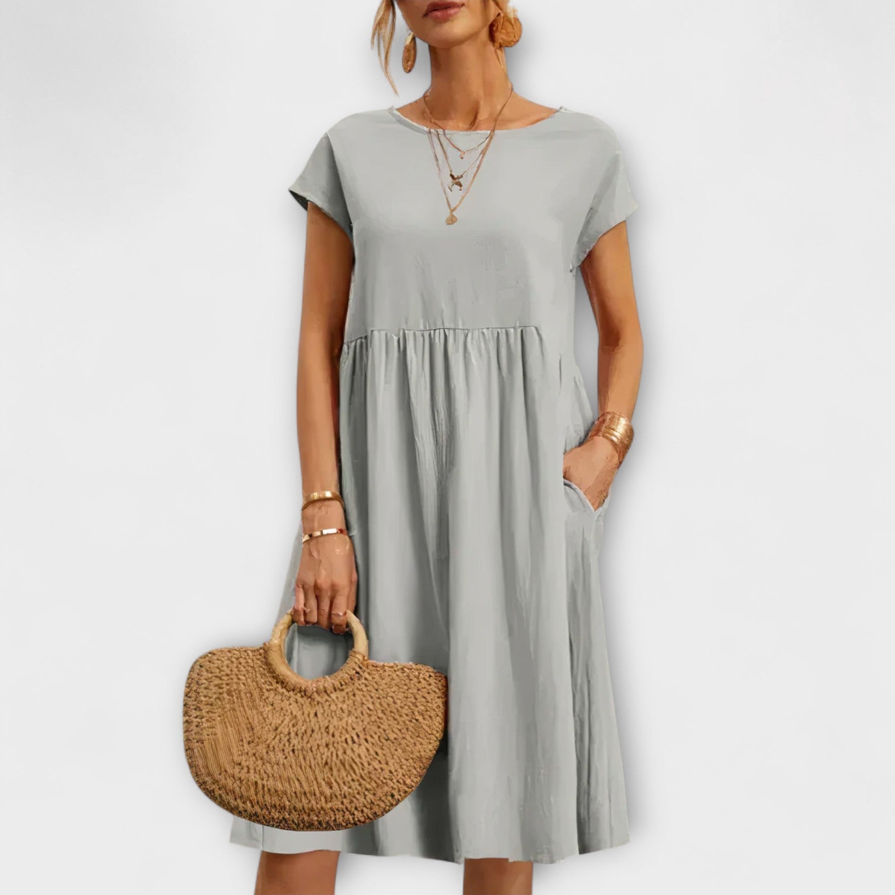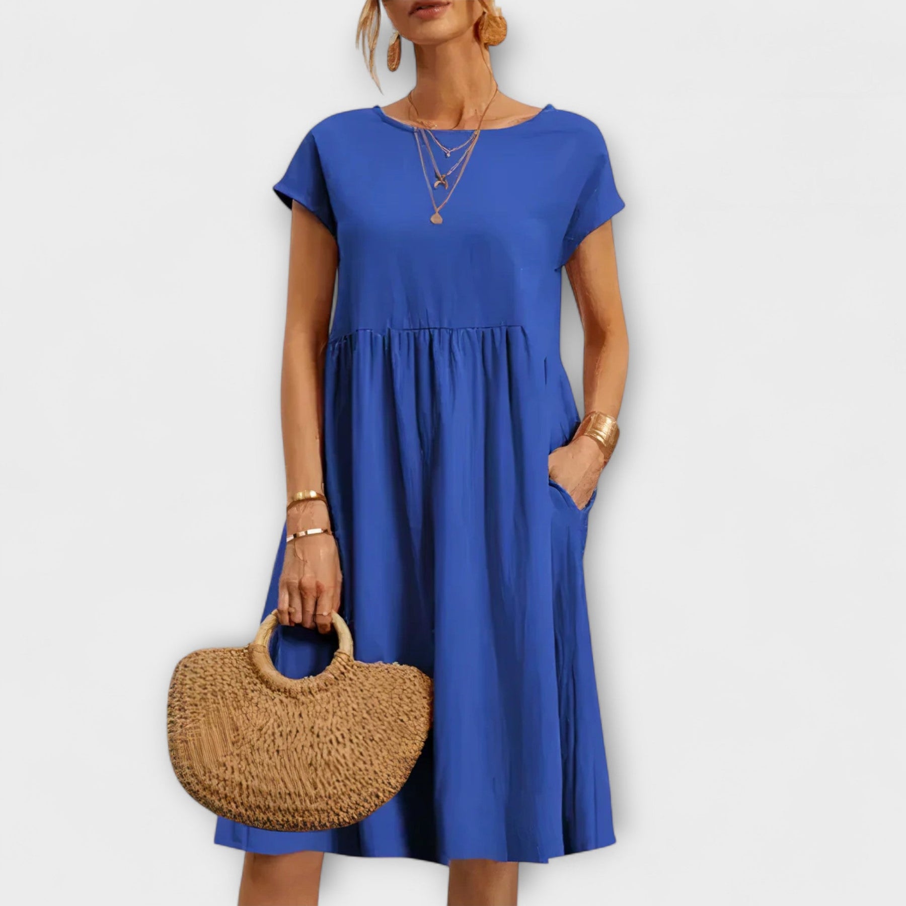 El vestido de verano hasta la rodilla de Luna combina elegancia estilosa con funcionalidad apta para el día a día. Su diseño clásico se adapta sin esfuerzo a cualquier atuendo, ya sea casual o elegante. Gracias a su suave tejido, disfrutarás de comodidad durante todo el día sin tener que renunciar al estilo.